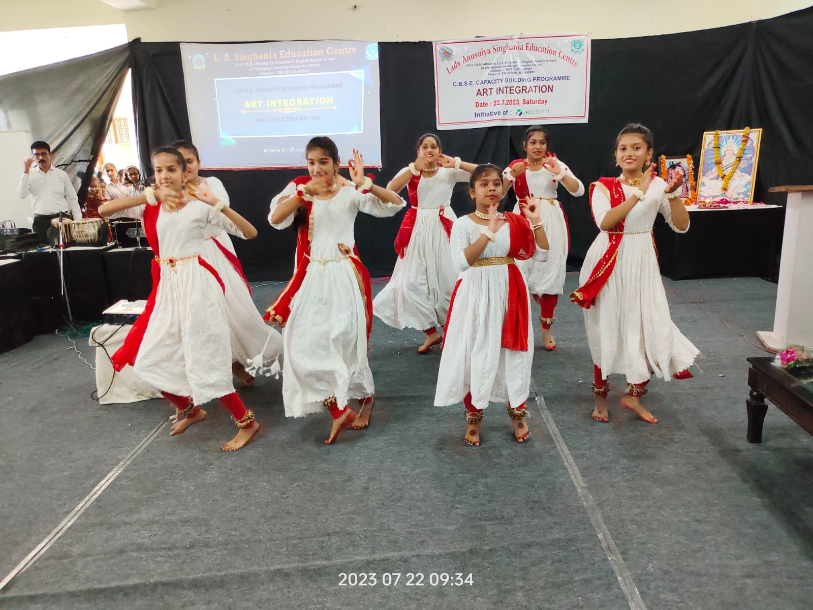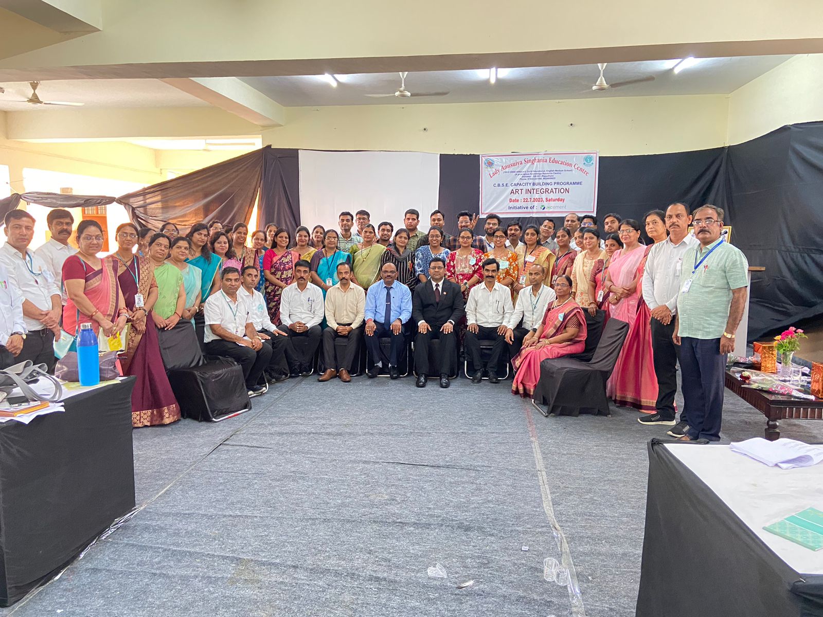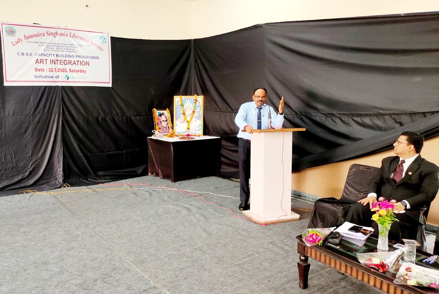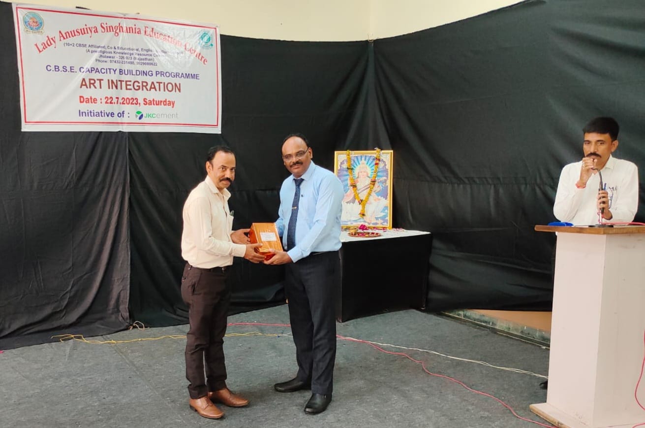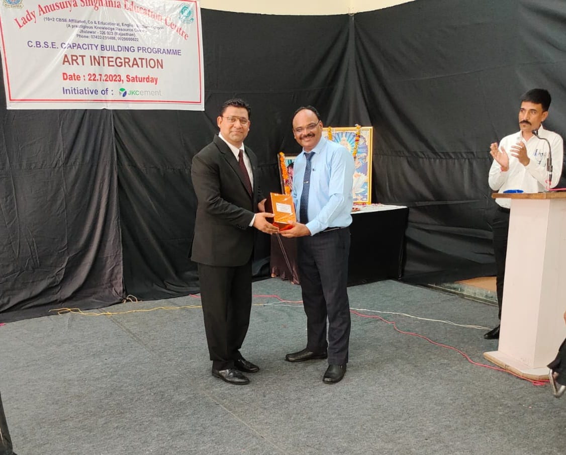 A workshop on Art Integration was organized by the CBSE at Lady Anusuiya Singhania Education Centre, Jhalawar on Saturday (22/07/2023). First of all garlands wreath on the pictures of Maa Saraswati and Lady Anusuiya and lamps were lit by Resource persons Mr. Amit Kumar Sharma, Principal, Maheshwari Public School, Kota, Mr. Inder Pratap Singh, PGT, Vardhaman International School, Jaipur and Dr. Arunesh Saxena, Principal, Lady Anusuiya Singhania Education Centre, Jhalawar. After that the girl students presented Saraswati Vandana, Katthak and Shiv Stuti through dance performance in honor of the guests. Respected Dr. Arunesh Saxena, Principal, Lady Anusuiya Singhania Education Centre, Jhalawar welcomed the guests by presenting bouquets. In the welcome address, Dr. Arunesh Saxena said that art integration is a new way of teaching different subjects in which various forms of art such as visual arts, performing art , theatre etc are used as teaching tools.