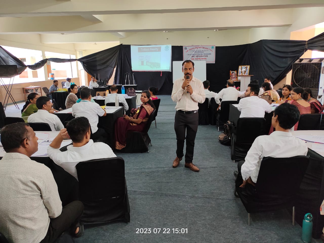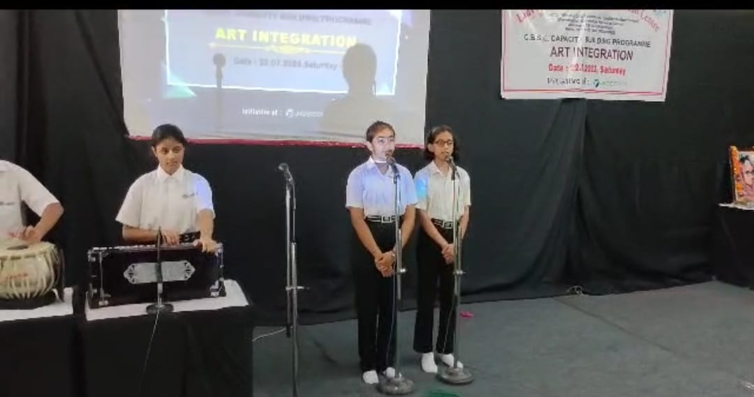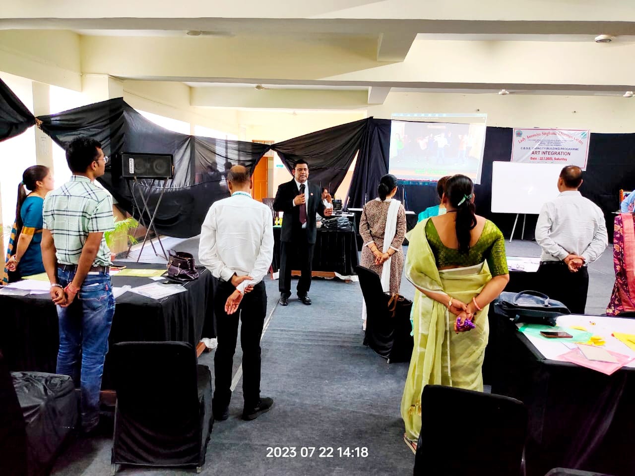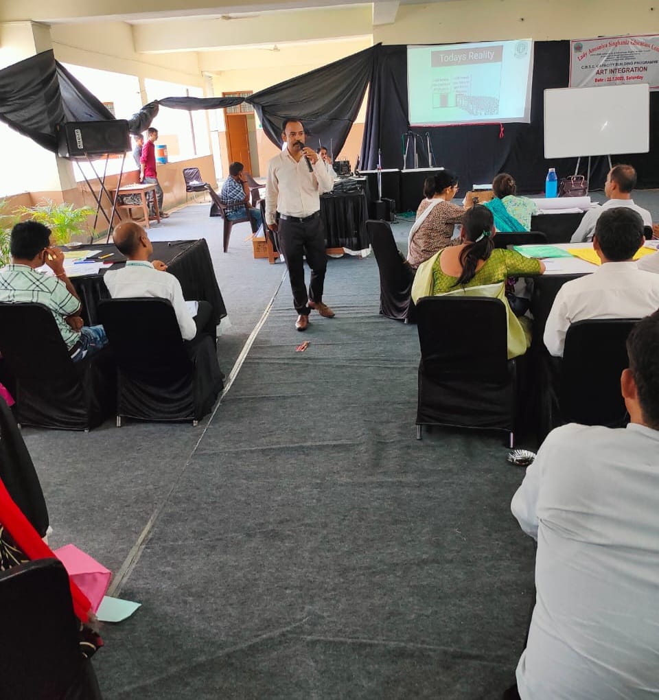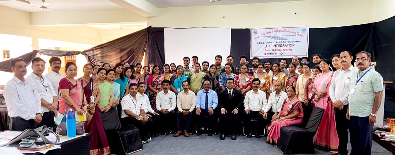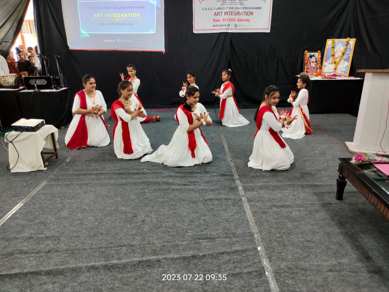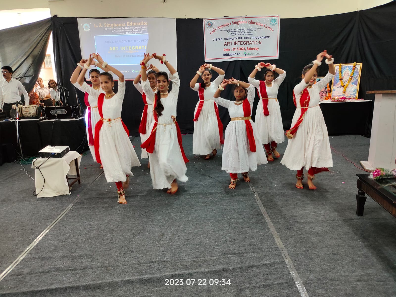A workshop on Art Integration was organized by the CBSE at Lady Anusuiya Singhania Education Centre, Jhalawar on Saturday (22/07/2023). First of all garlands wreath on the pictures of Maa Saraswati and Lady Anusuiya and lamps were lit by Resource persons Mr. Amit Kumar Sharma, Principal, Maheshwari Public School, Kota, Mr. Inder Pratap Singh, PGT, Vardhaman International School, Jaipur and Dr. Arunesh Saxena, Principal, Lady Anusuiya Singhania Education Centre, Jhalawar. After that the girl students presented Saraswati Vandana, Katthak and Shiv Stuti through dance performance in honor of the guests. Respected Dr. Arunesh Saxena, Principal, Lady Anusuiya Singhania Education Centre, Jhalawar welcomed the guests by presenting bouquets. In the welcome address, Dr. Arunesh Saxena said that art integration is a new way of teaching different subjects in which various forms of art such as visual arts, performing art , theatre etc are used as teaching tools.