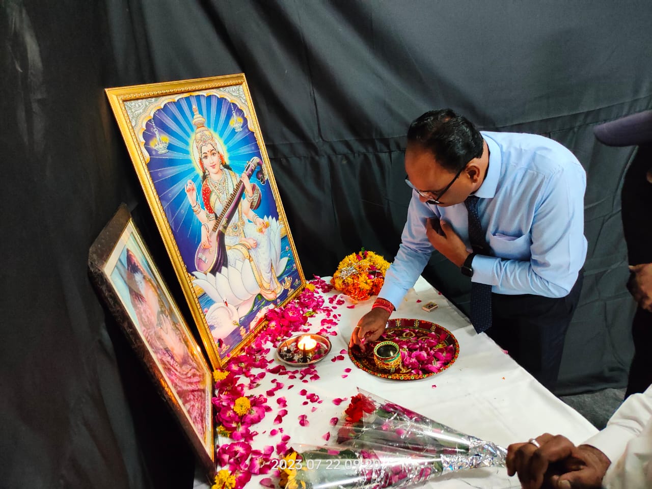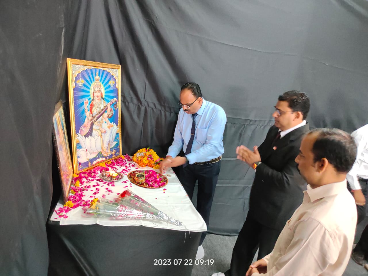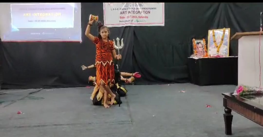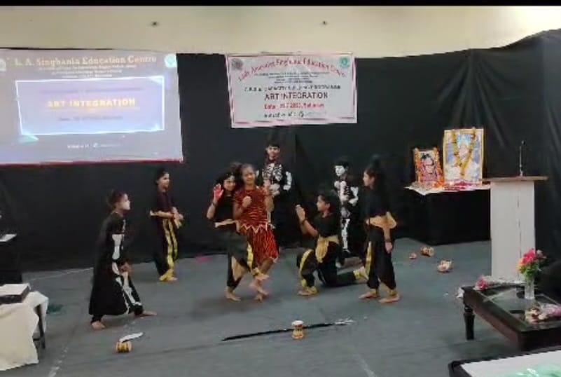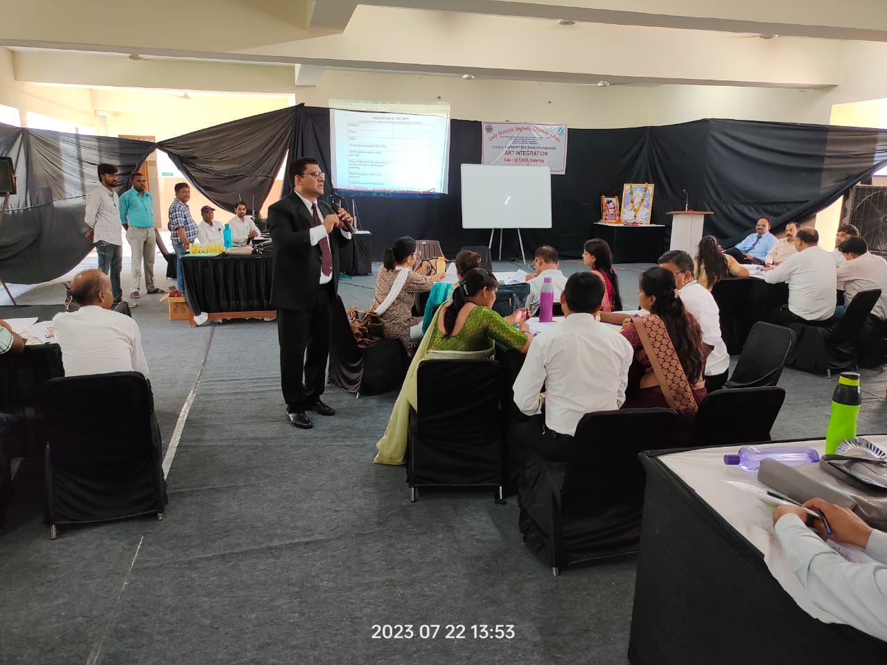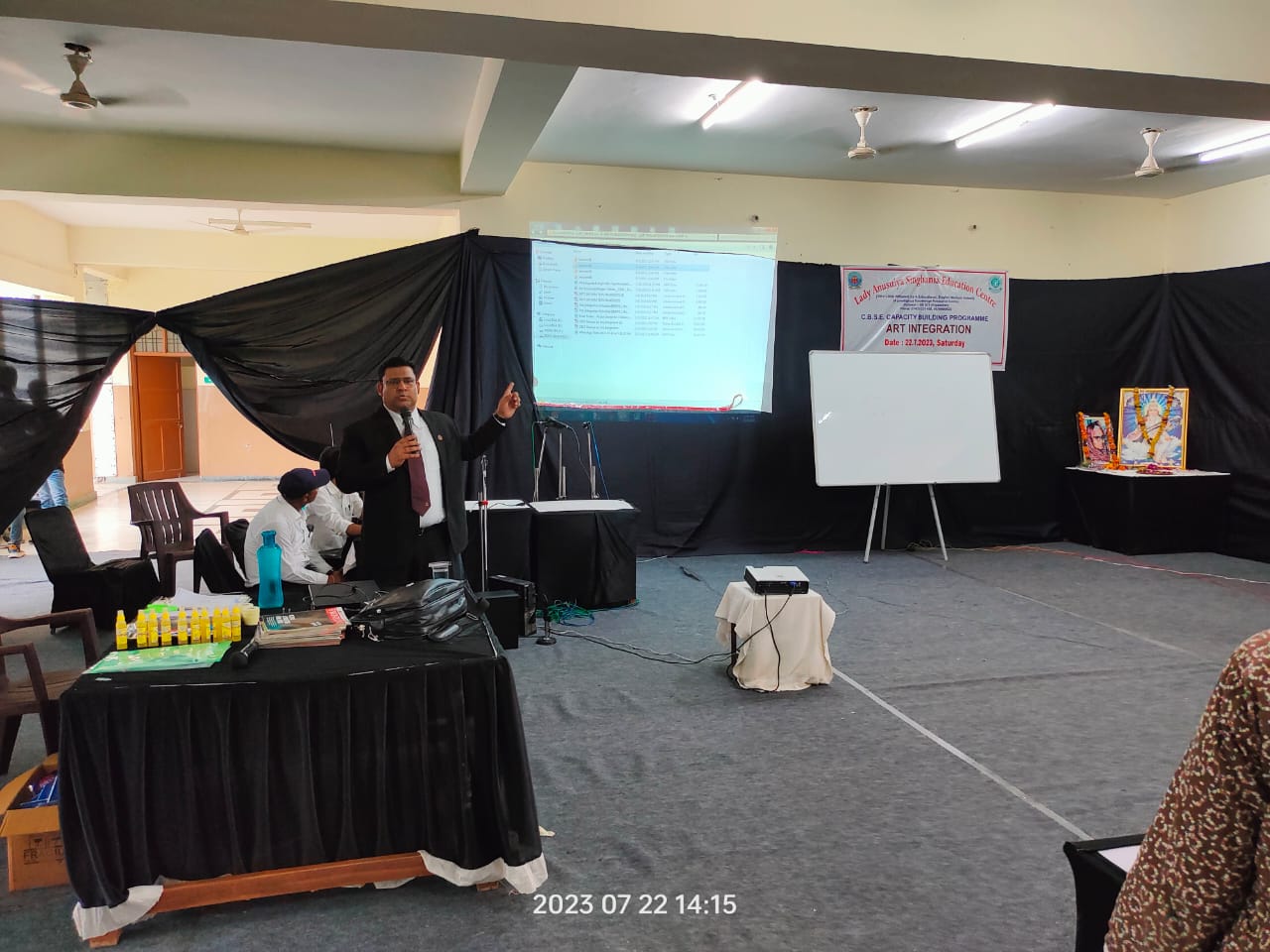 A workshop on Art Integration was organized by the CBSE at Lady Anusuiya Singhania Education Centre, Jhalawar on Saturday (22/07/2023). First of all garlands wreath on the pictures of Maa Saraswati and Lady Anusuiya and lamps were lit by Resource persons Mr. Amit Kumar Sharma, Principal, Maheshwari Public School, Kota, Mr. Inder Pratap Singh, PGT, Vardhaman International School, Jaipur and Dr. Arunesh Saxena, Principal, Lady Anusuiya Singhania Education Centre, Jhalawar. After that the girl students presented Saraswati Vandana, Katthak and Shiv Stuti through dance performance in honor of the guests. Respected Dr. Arunesh Saxena, Principal, Lady Anusuiya Singhania Education Centre, Jhalawar welcomed the guests by presenting bouquets. In the welcome address, Dr. Arunesh Saxena said that art integration is a new way of teaching different subjects in which various forms of art such as visual arts, performing art , theatre etc are used as teaching tools.