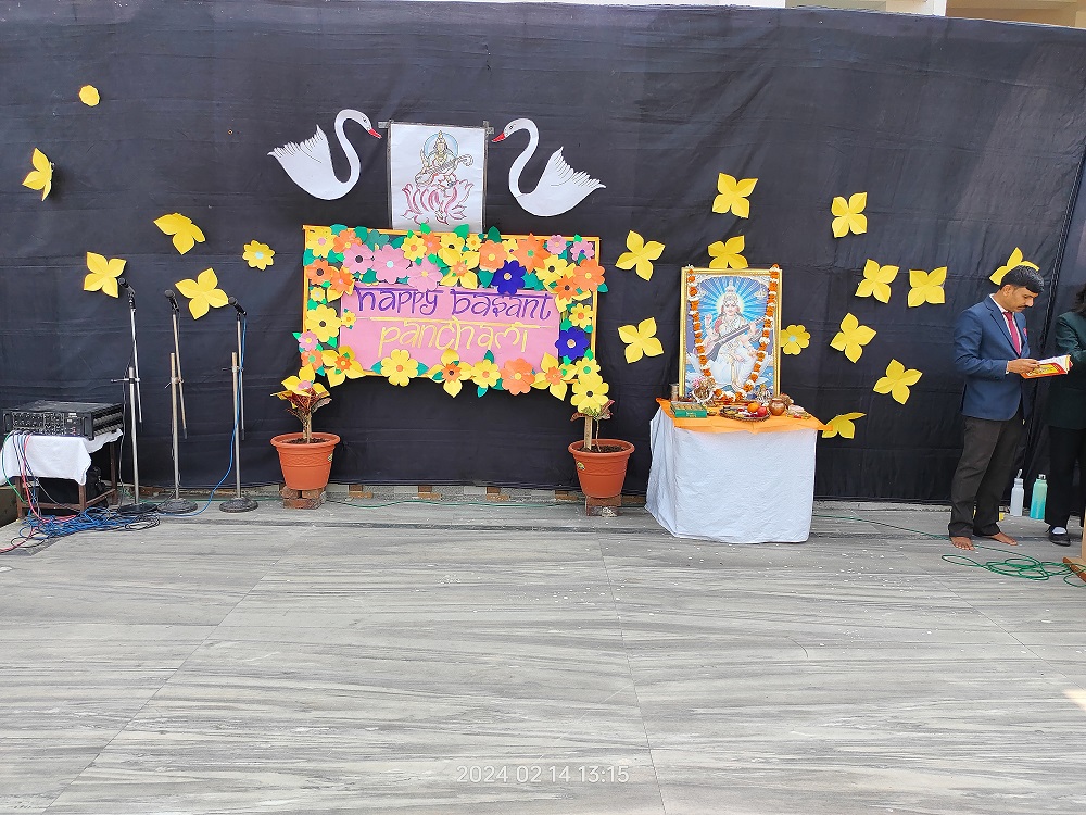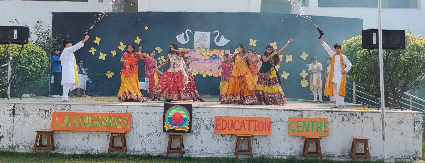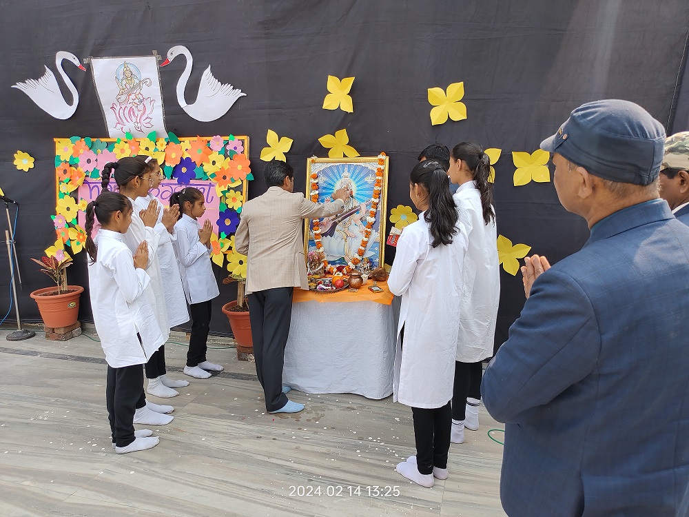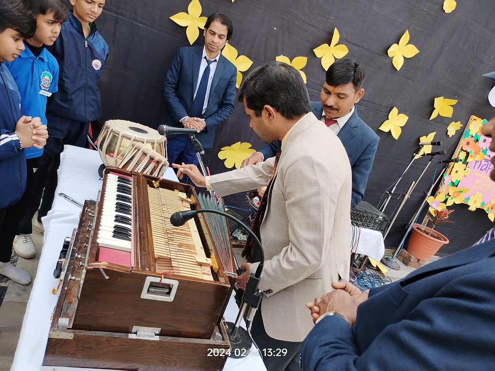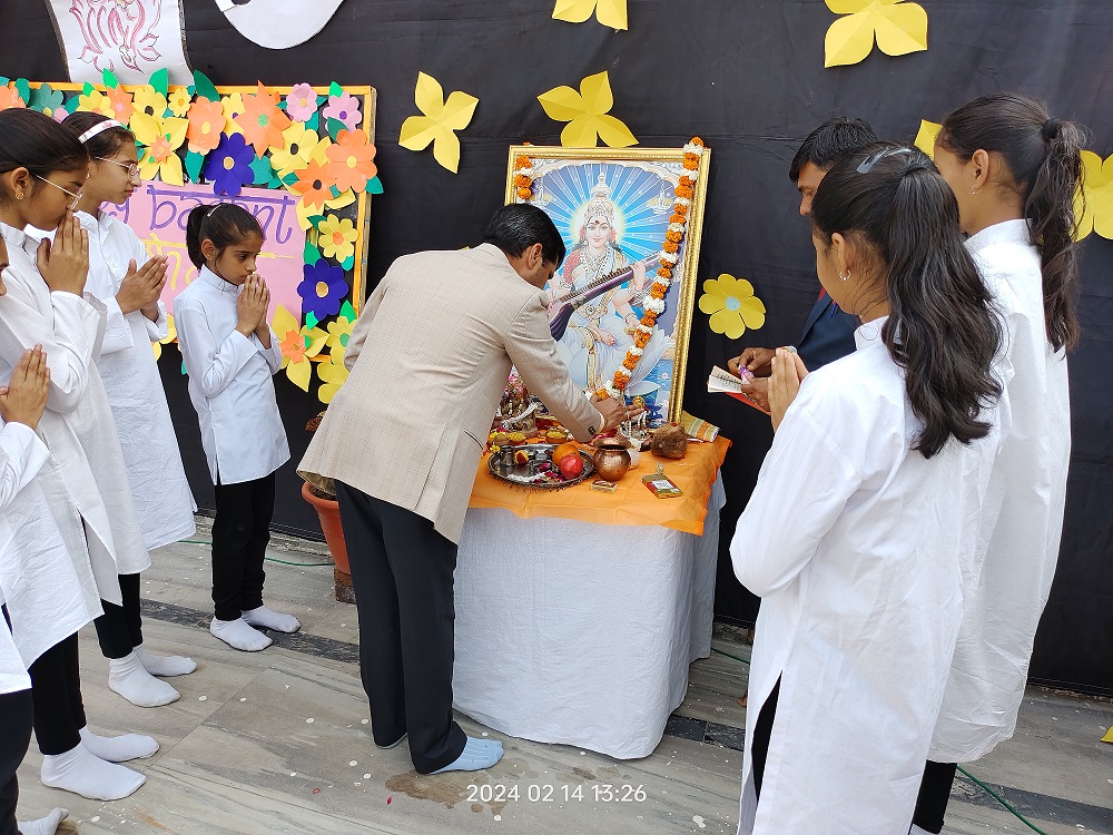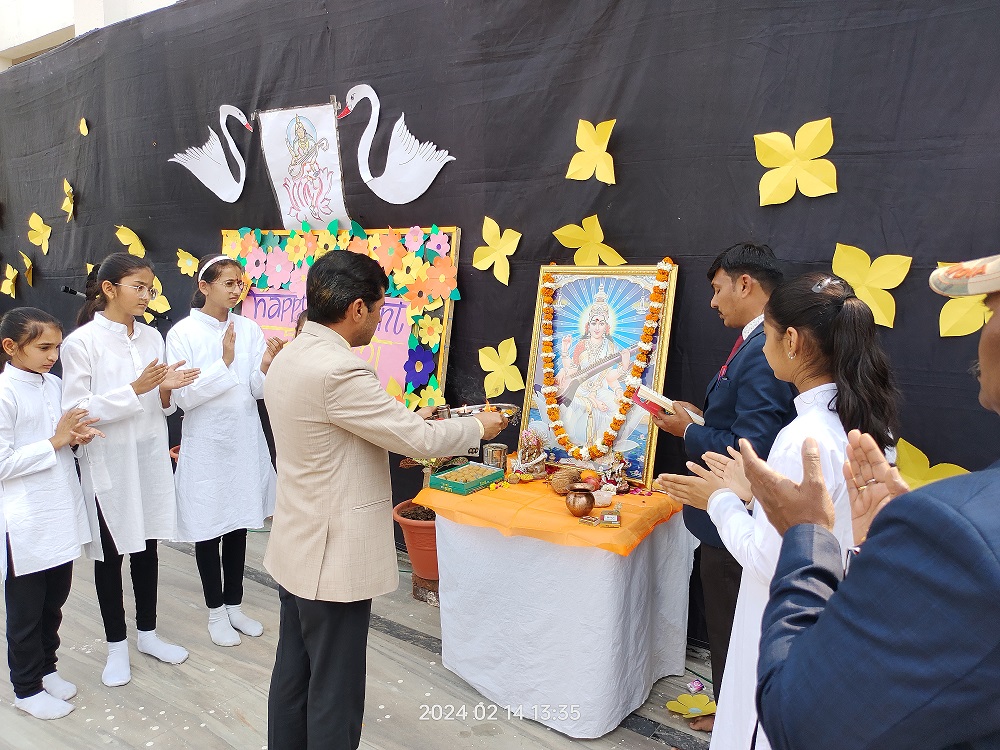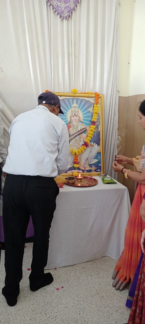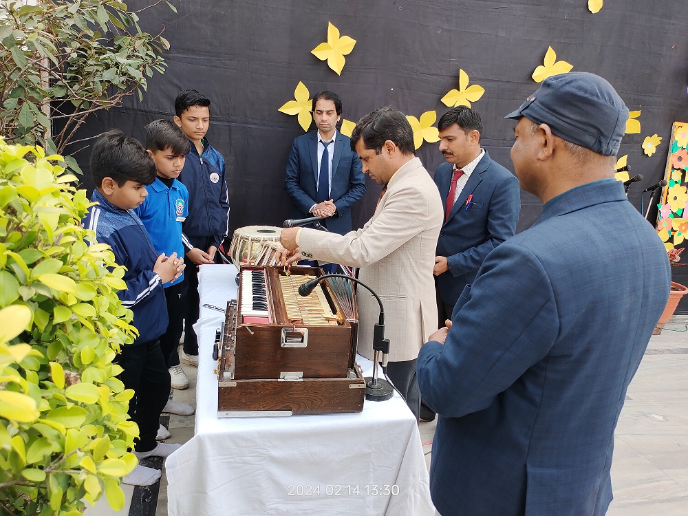 The celebration kick started at 9:15 a.m. with the lighting of lamp & garlanding the photograph of Goddess Saraswati by our honorable Principal Sir Dr. Arunesh Saxena, Mr Mumtaz Khan, CCA incharge (classes 6 to 12),Mrs Neena Sharma, CCA incharge (classes 1 to 5) and HOD English Mr Piyush Mathur . Under the guidance of teachers Chetna Sharma and Gunjan Deora, the children of NUR, LKG, UKG staged a scintillating dance performance. Under the mentorship of dance teacher Mrs. Pinky Rawal, the children of classes III to IX danced on bhajan, Shri Krishna Govind Hare Murari and Rajasthani Ghoomar. New students presented musical orchestra and group song under the guidance of music teacher Mr Tulsiram Saini.