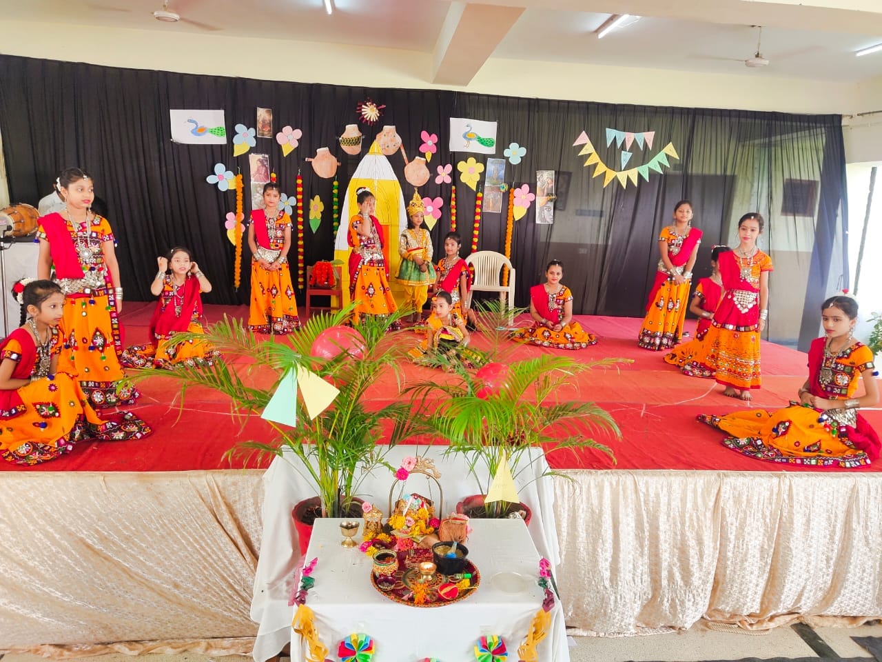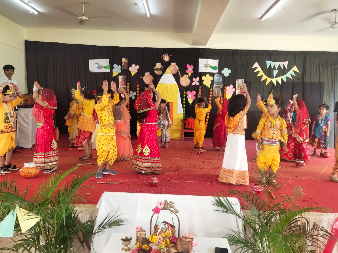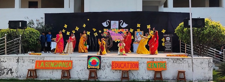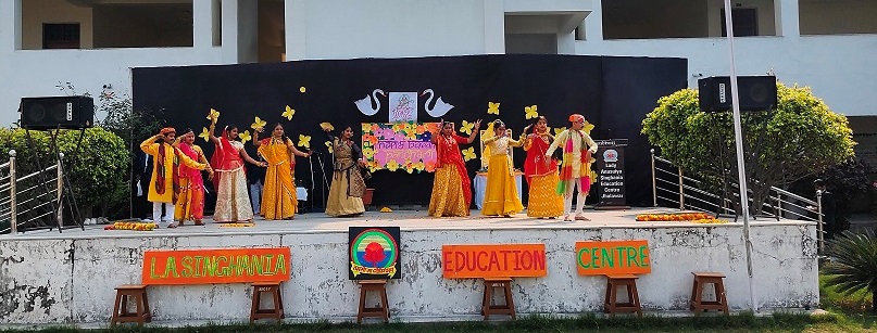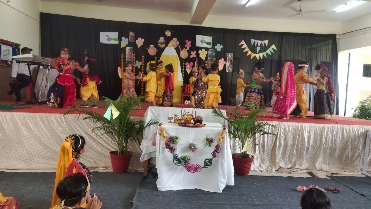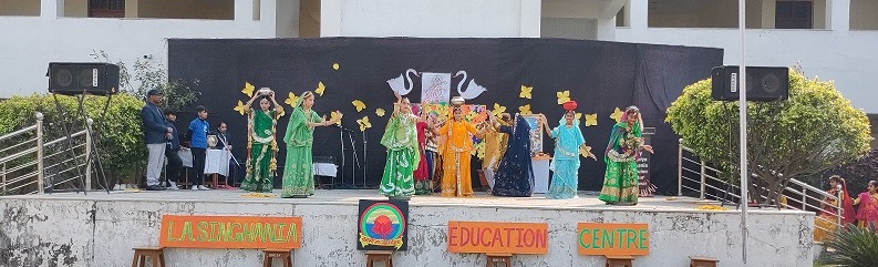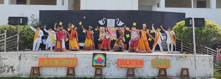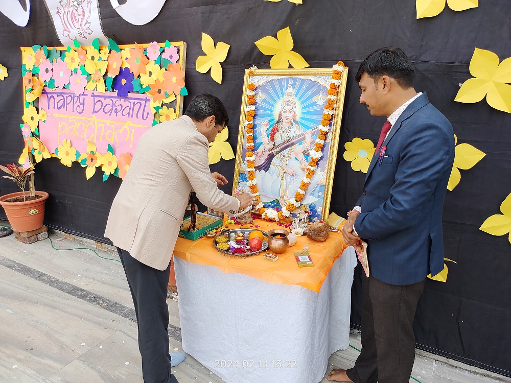 The celebration kick started at 9:15 a.m. with the lighting of lamp & garlanding the photograph of Goddess Saraswati by our honorable Principal Sir Dr. Arunesh Saxena, Mr Mumtaz Khan, CCA incharge (classes 6 to 12),Mrs Neena Sharma, CCA incharge (classes 1 to 5) and HOD English Mr Piyush Mathur . Under the guidance of teachers Chetna Sharma and Gunjan Deora, the children of NUR, LKG, UKG staged a scintillating dance performance. Under the mentorship of dance teacher Mrs. Pinky Rawal, the children of classes III to IX danced on bhajan, Shri Krishna Govind Hare Murari and Rajasthani Ghoomar. New students presented musical orchestra and group song under the guidance of music teacher Mr Tulsiram Saini.