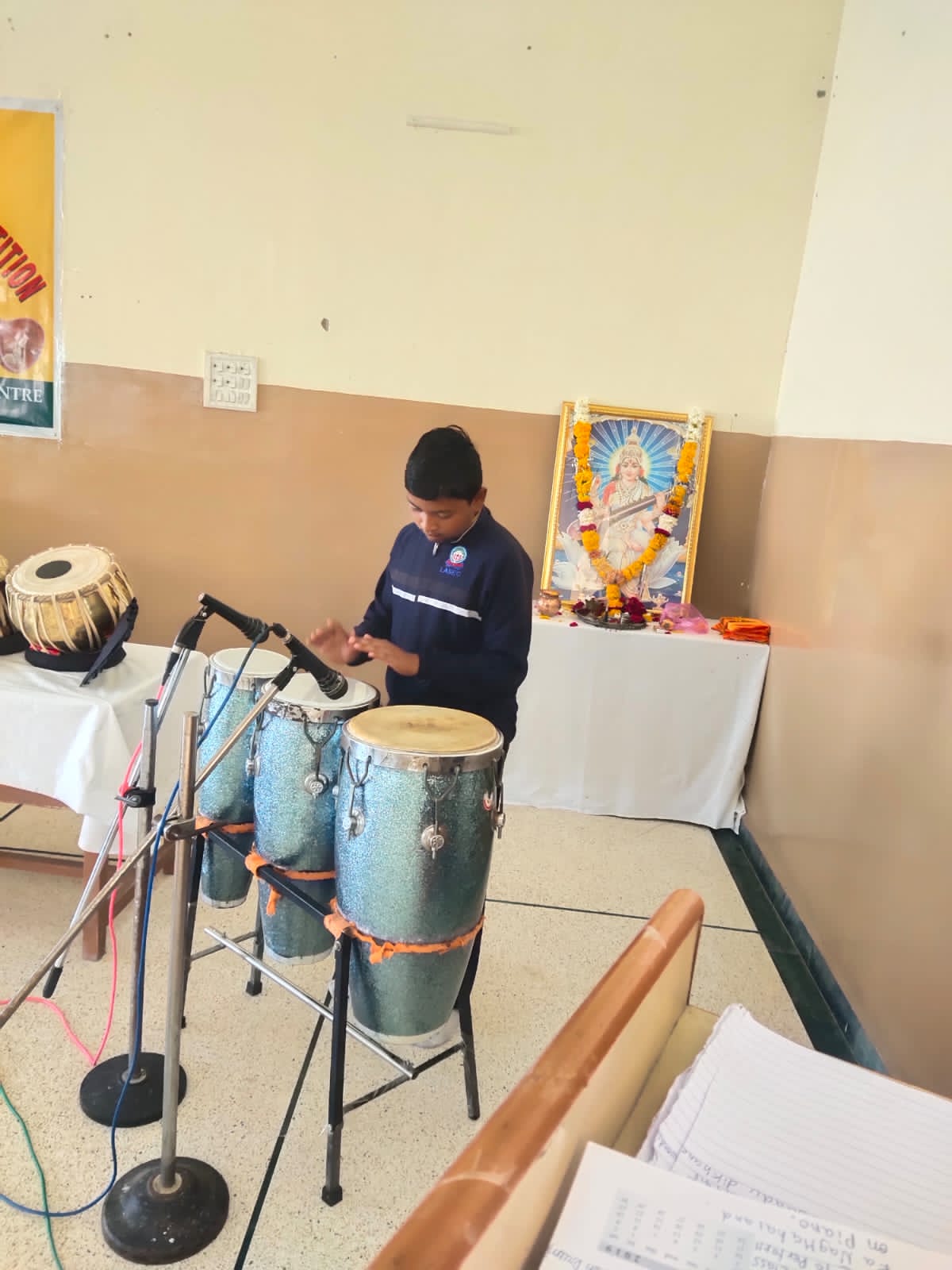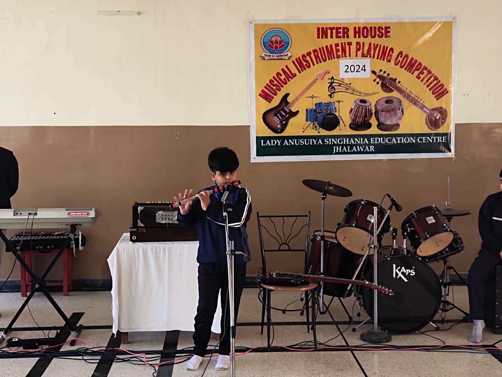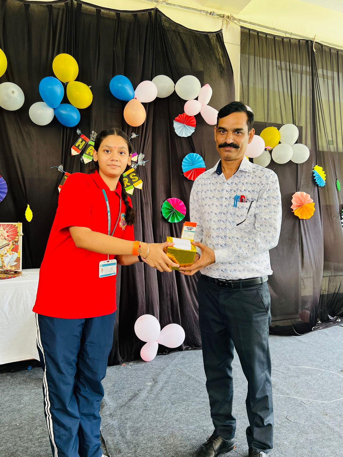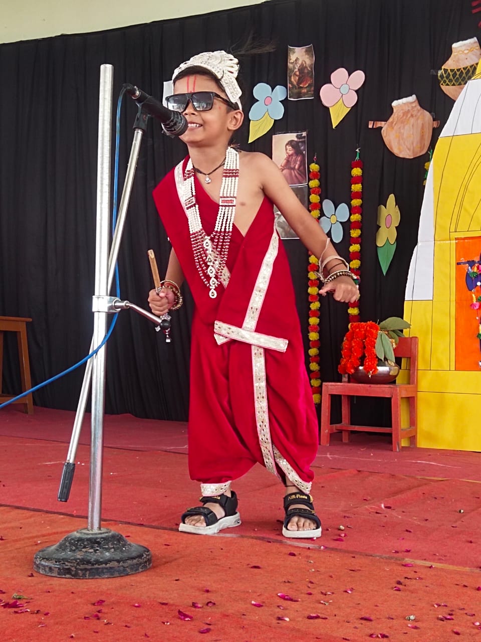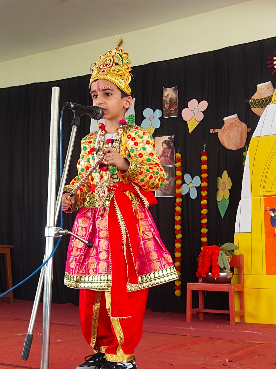 The celebration kick started at 9:15 a.m. with the lighting of lamp & garlanding the photograph of Goddess Saraswati by our honorable Principal Sir Dr. Arunesh Saxena, Mr Mumtaz Khan, CCA incharge (classes 6 to 12),Mrs Neena Sharma, CCA incharge (classes 1 to 5) and HOD English Mr Piyush Mathur . Under the guidance of teachers Chetna Sharma and Gunjan Deora, the children of NUR, LKG, UKG staged a scintillating dance performance. Under the mentorship of dance teacher Mrs. Pinky Rawal, the children of classes III to IX danced on bhajan, Shri Krishna Govind Hare Murari and Rajasthani Ghoomar. New students presented musical orchestra and group song under the guidance of music teacher Mr Tulsiram Saini.