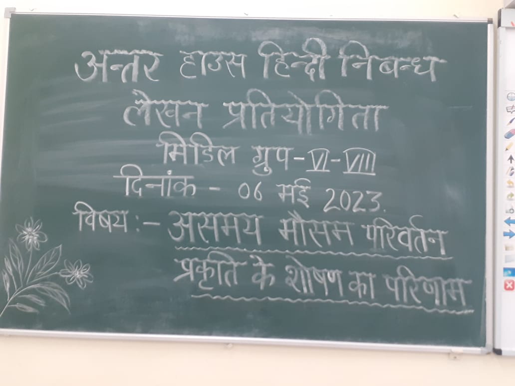 छात्रों की लेखन क्षमता को विकसित करने के उद्देश्य से मिडिल ग्रुप की हिंदी निबंध लेखन प्रतियोगिता का आयोजन किया गया।इस प्रतियोगिता मे कक्षा 6,7 तथा 8 के लगभग 60 विद्यार्थियों ने भाग लिया।निबंध प्रतियोगिता का विषय "असमय मौसम परिवर्तन प्रकृति के शोषण का परिणाम"।