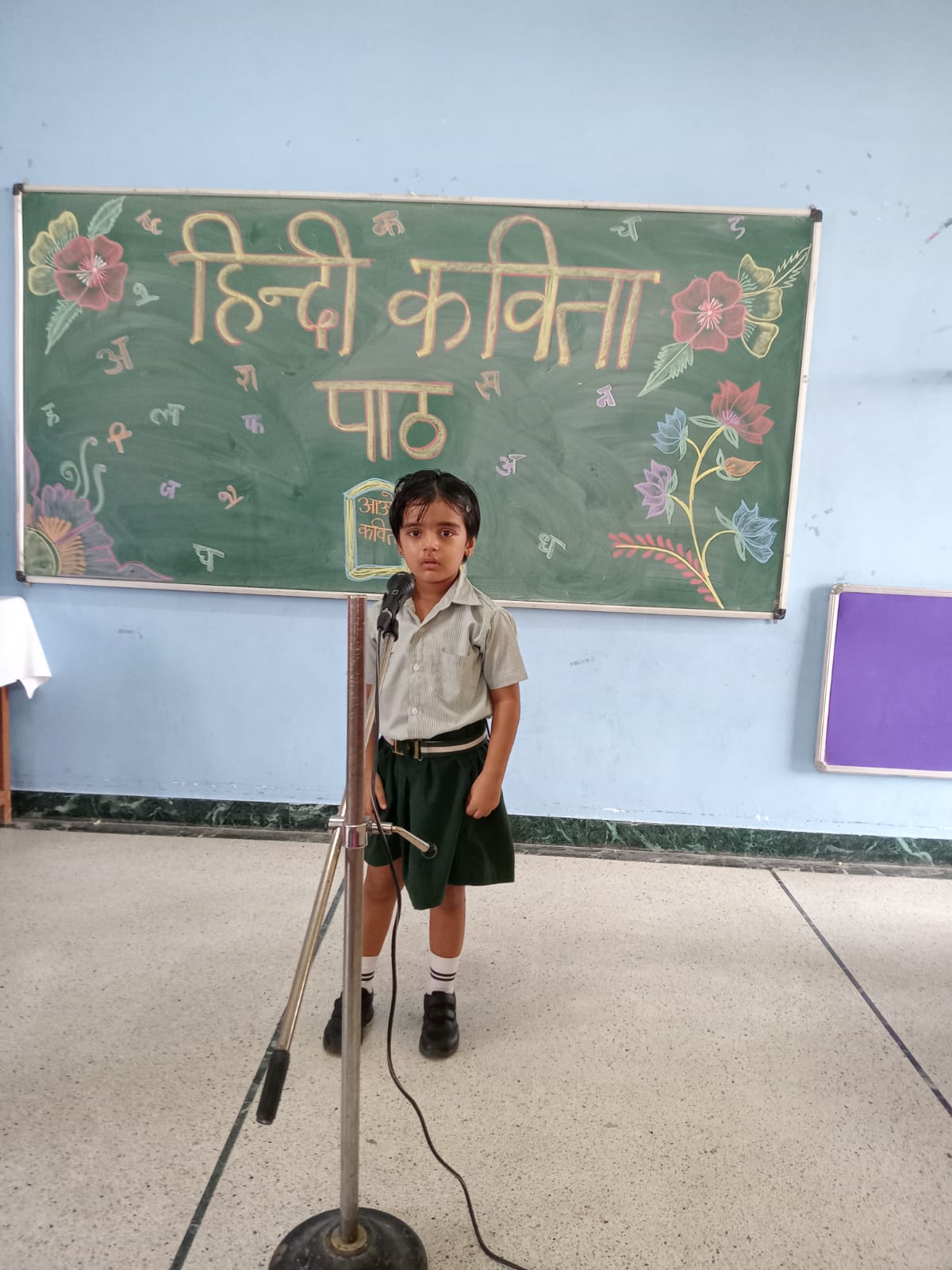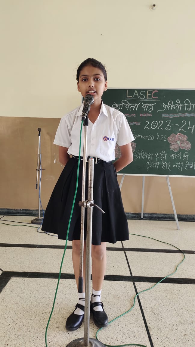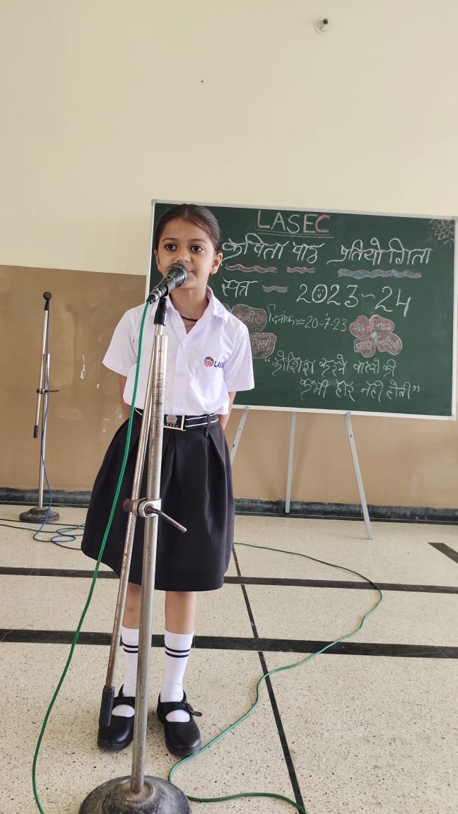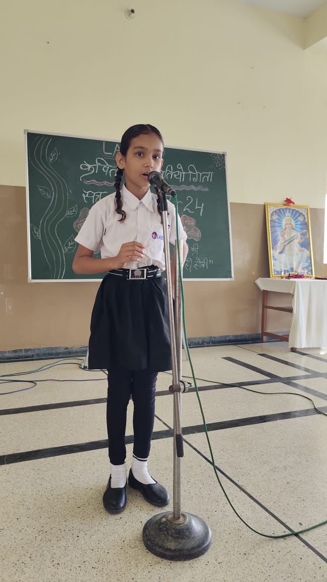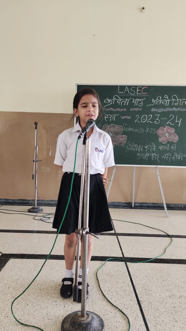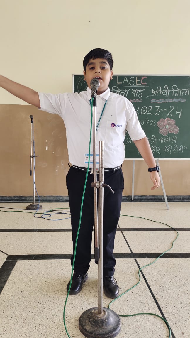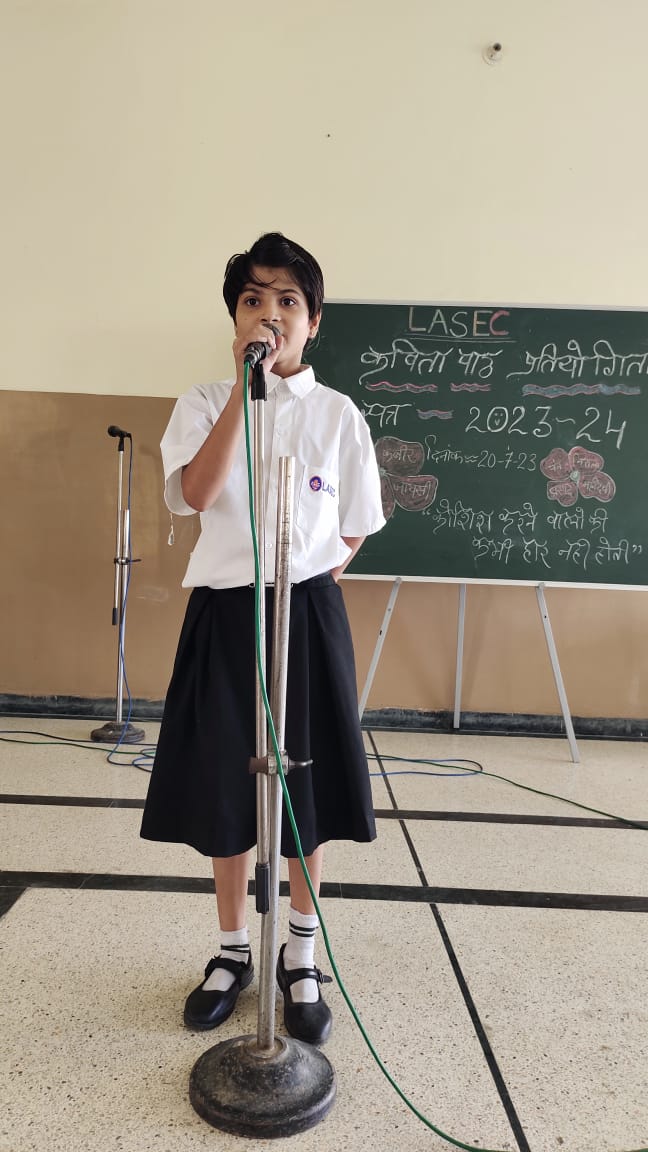 विद्यार्थियों मे हिंदी भाषा के प्रति अनुराग जगाने और वाचन क्षमता विकसित करने के उद्देश्य से विद्यालय में सब जूनियर ग्रुप के बच्चो की कविता पाठ प्रतियोगिता का आयोजन किया गया।शुरुआत प्रधानाचार्य डॉक्टर अरुणेश सक्सेना जी, विभागाध्यक्ष मनीष चतुर्वेदी और जूनियर सीसीए इंचार्ज नीना शर्मा के द्वारा माँ सरस्वती की पूजा और वंदना के साथ हुई।कार्यक्रम मे निर्णायक श्री देवेंद्र सिंह और श्रीमती गरिमा गोयल रही।बच्चो ने बहुत सुंदर और हृदय स्पर्शी कविता पाठ किया।समापन मे प्रधानाचार्य ने बच्चो को प्रेरणास्पद उदबोधन दिया। कार्यक्रम का संचालन शिक्षिका दिव्या सिसोदिया ने दिया।