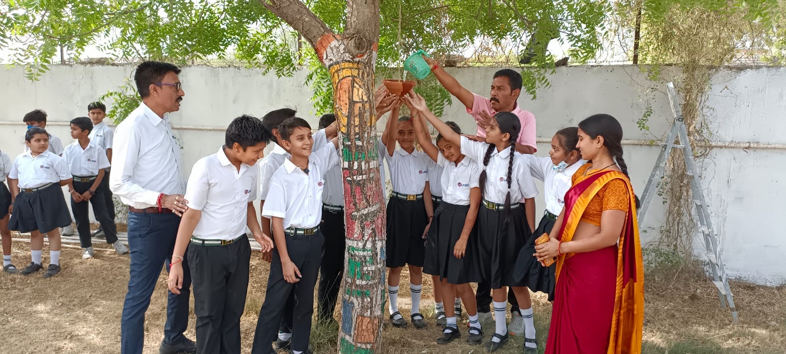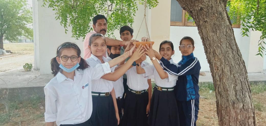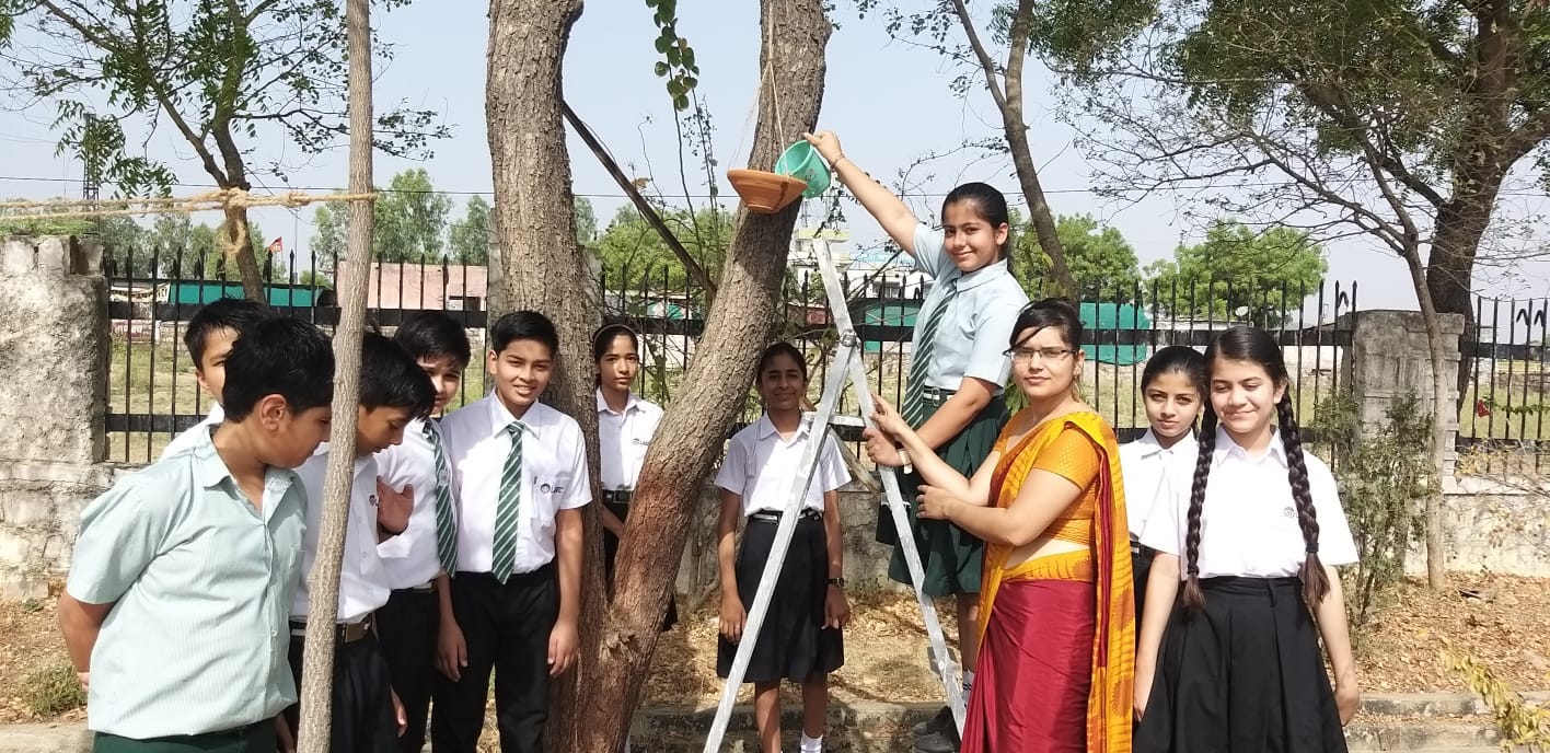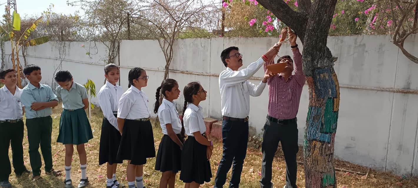 students tied Parindey (earthen pots) on the branches of the shady trees all around in the school campus to provide food and