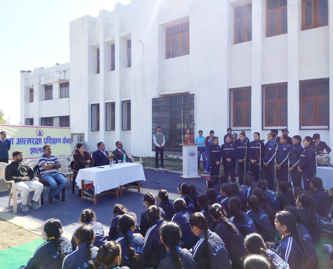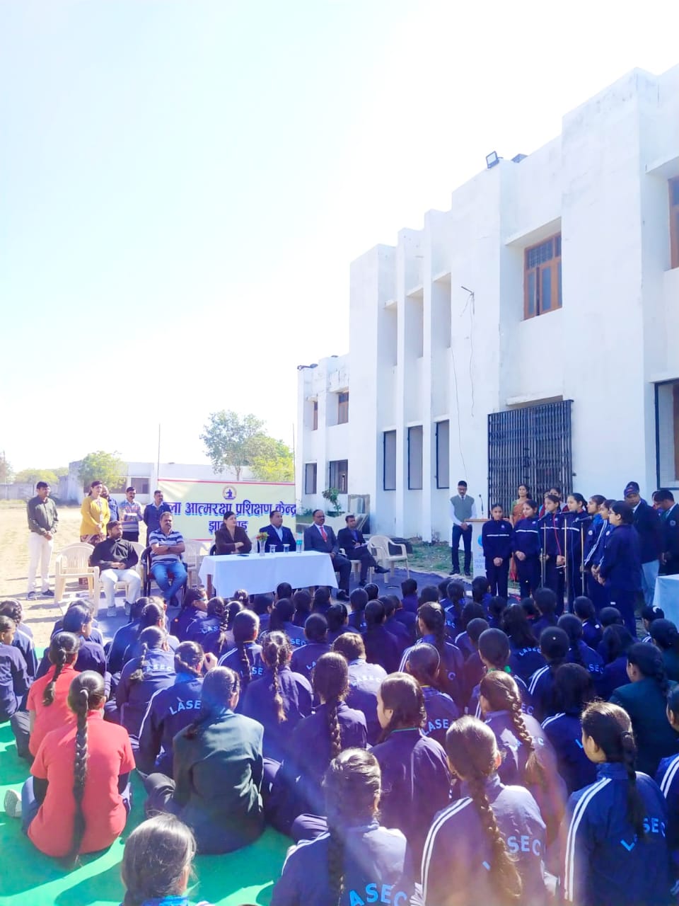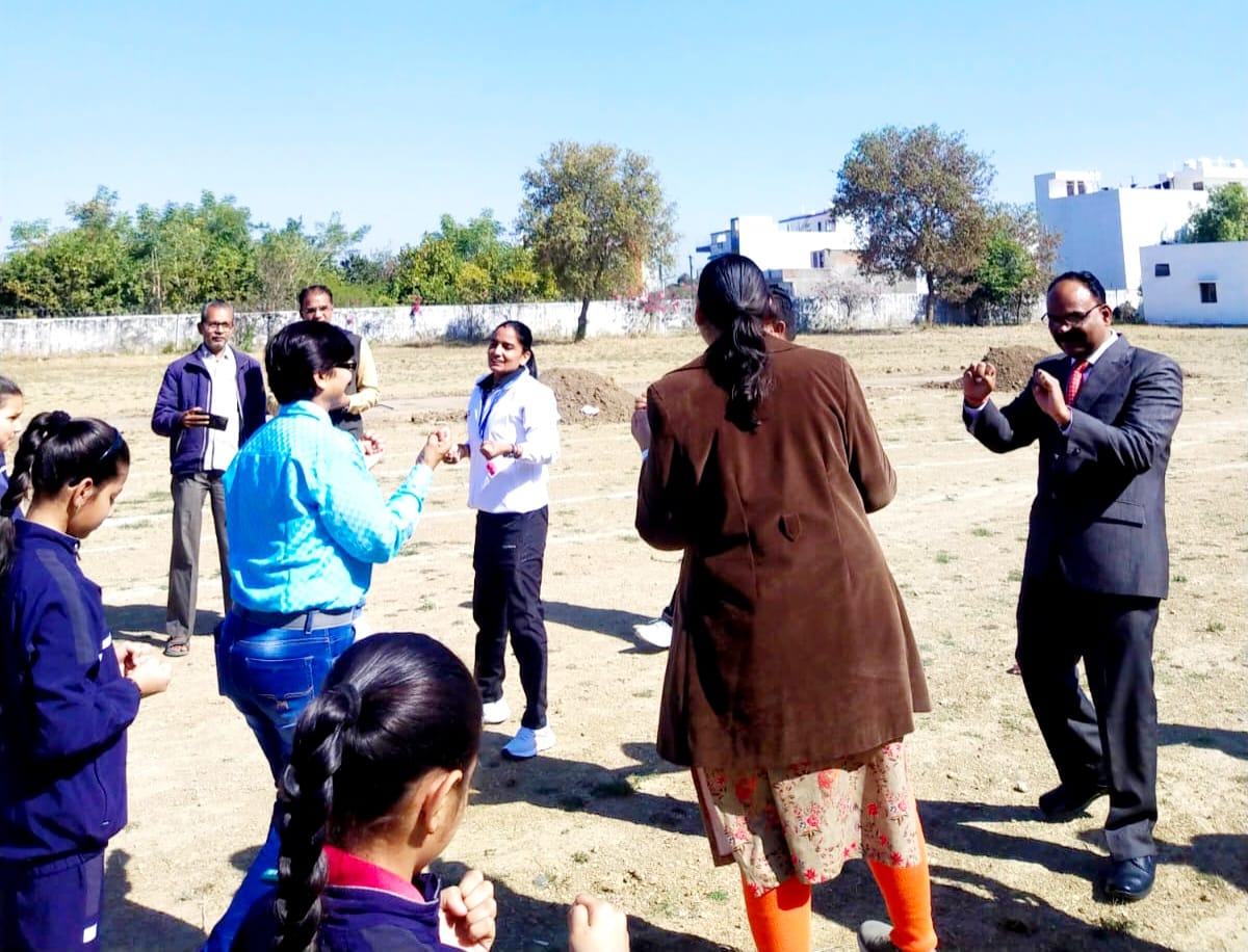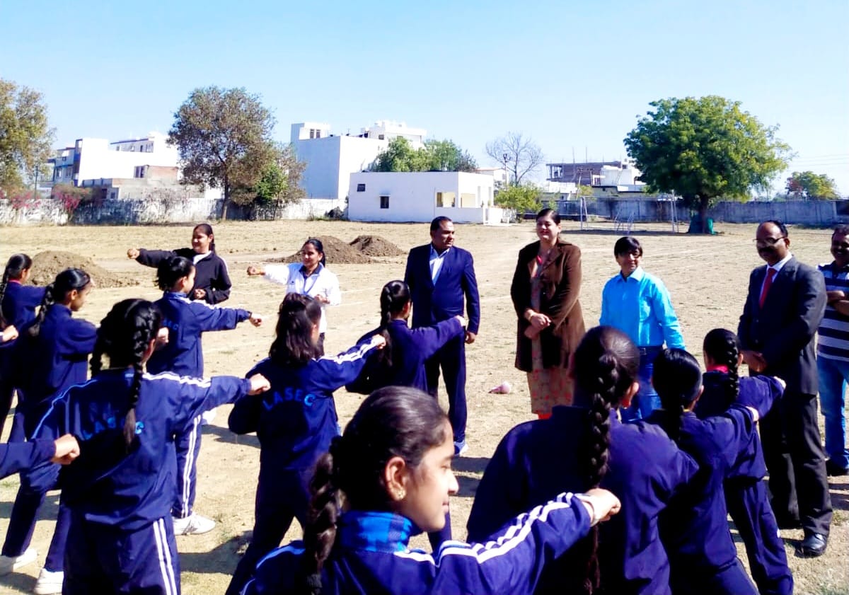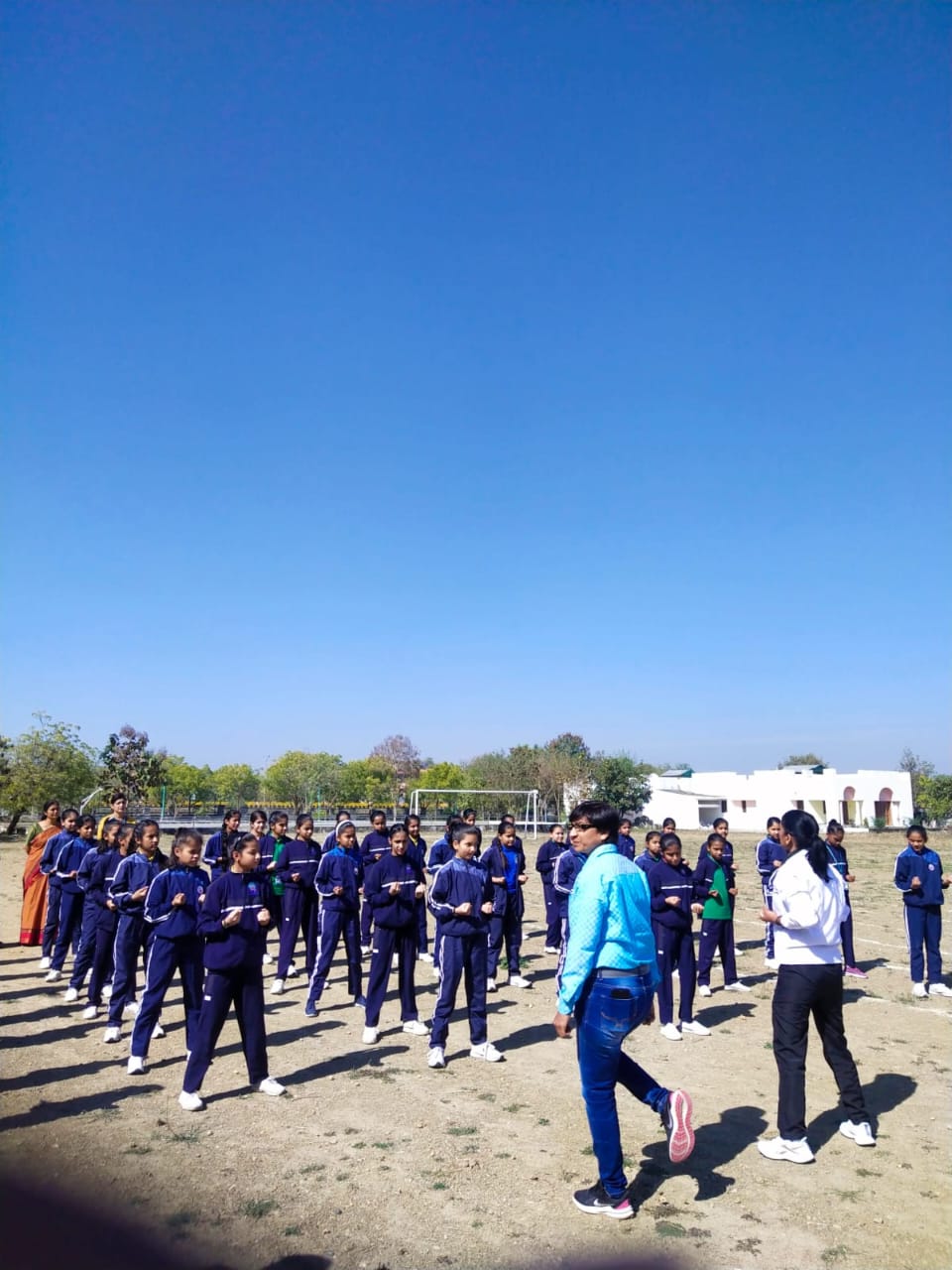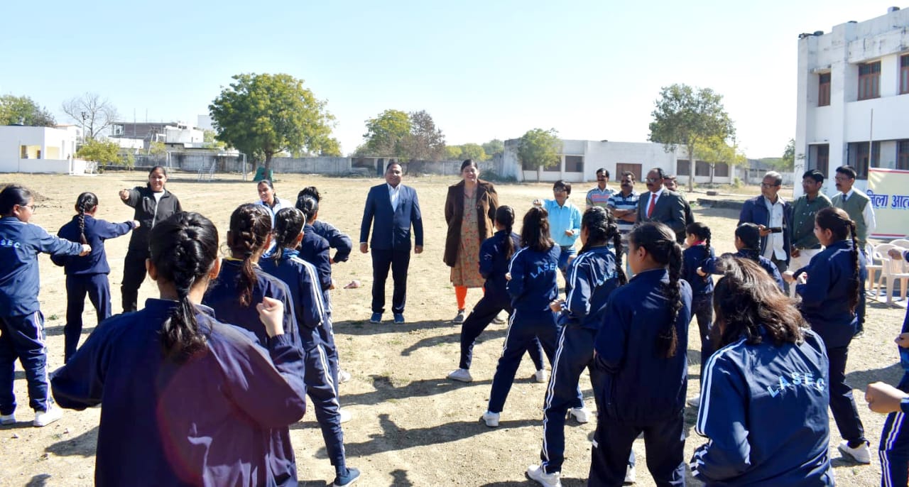 Seven days workshop on self defense for girls of VI to IX and XI was inaugurated by District Collector Dr Bharti Dixit. She was welcomed by Principal Dr Arunesh Saxena. Along with her , Shri Hans Raj Meena ADEO Jhalawar and Shri Kripa Shankar Sports Officer also graced the occasion. Group of girls sang school song to welcome guests.